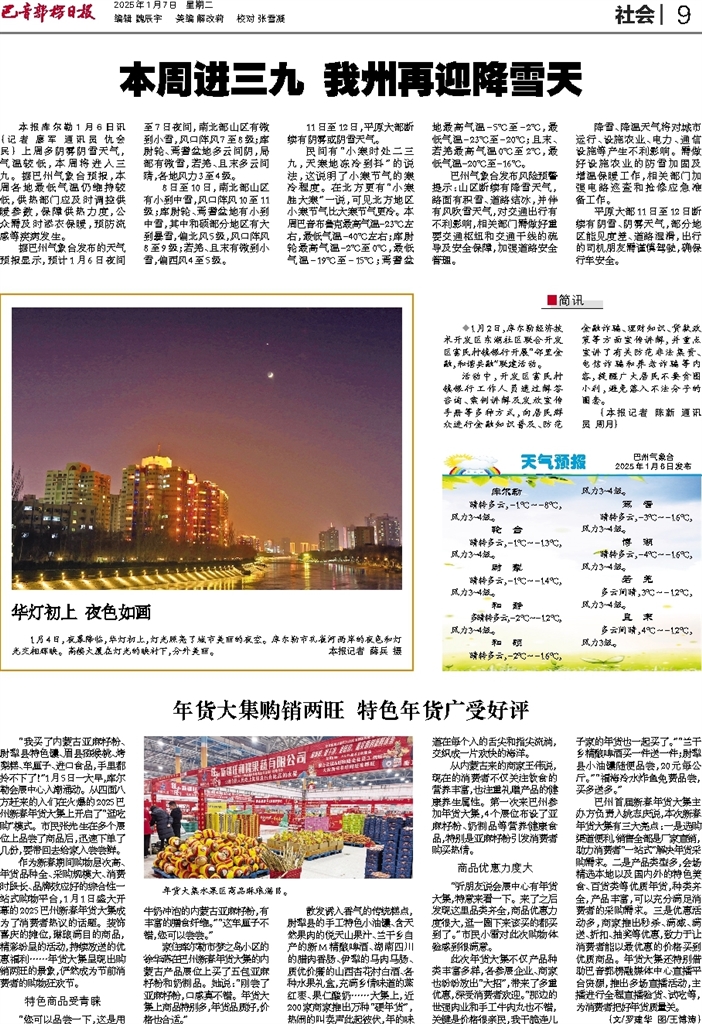 - 本周进三九 我州再迎降雪天 本报库尔勒1月6日讯 (记者 廖军 通讯员 仇会民) 上周多阴雾阴雪天气,气温较低,本周将进入三九。据巴州气象台预报,本周各地最低气温仍维持较低,供热部门应及时调控供暖参数,保障供热力度,公众需及
