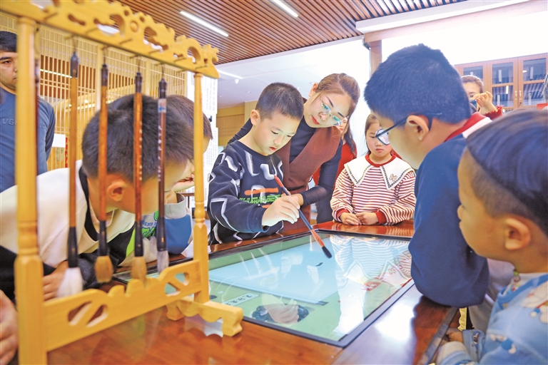 2月9日,巴州图书馆内人气满满,学生们围在书桌旁,欣赏一名同学在电子屏幕上书写毛笔字。