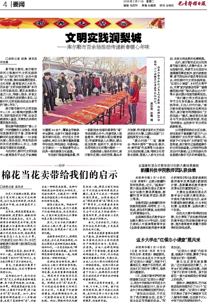 - 文明实践润梨城 □本报记者 赵爽 通讯员 吕世箴 春节假日期间,库尔勒市依托三级新时代文明实践阵地,以“我们的节日·欢乐中国年”为主题,推出涵盖惠民服务、文化传承、教育宣讲三大系列、百余场“文明实践贺