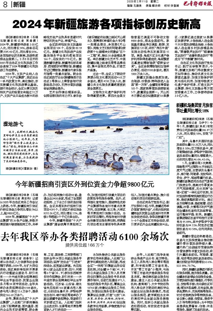 - 2024年新疆旅游各项指标创历史新高 据《新疆日报》消息 (石榴云/新疆日报记者 贾春霞) 2024年,新疆接待游客3.02亿人次,同比增长14%,游客总花费3595.42亿元,同比增长21%,各项指标创历史新高,旅游热度排名全国第二