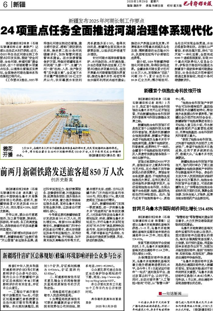 - 24项重点任务全面推进河湖治理体系现代化 据《新疆日报》消息 (石榴云/新疆日报记者 康颢严) 记者从自治区水利厅获悉:近日,《2025年自治区河湖长制工作要点》印发实施,围绕“安全河湖、生命河湖、幸福河湖”建设目标,在7个领域部署24项