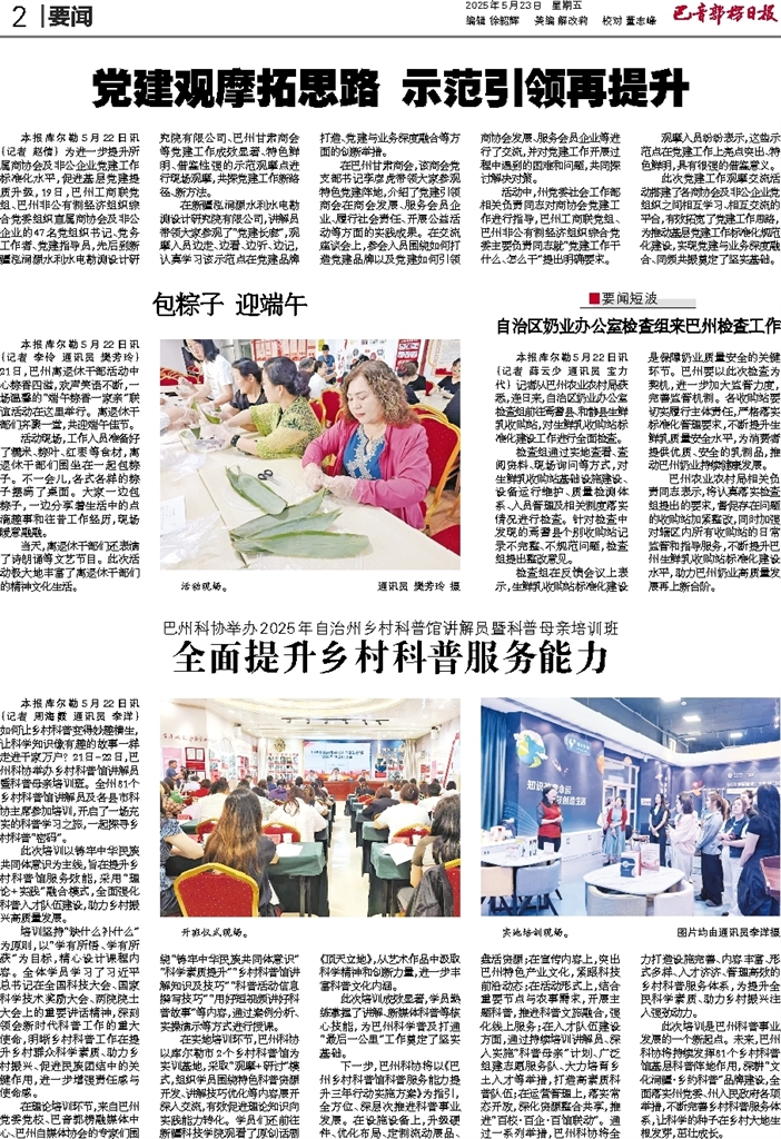 - 党建观摩拓思路 示范引领再提升 本报库尔勒5月22日讯 (记者 赵倩) 为进一步提升所属商协会及非公企业党建工作标准化水平,促进基层党建提质升级,19日,巴州工商联党组、巴州非公有制经济组织综合党委组织直属商协会及非公企业的47