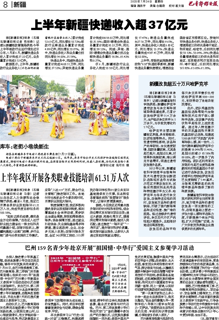 - 上半年新疆快递收入超37亿元 据《新疆日报》消息 (石榴云/新疆日报记者 范琼燕) 记者从新疆邮政管理局获悉:今年上半年邮政行业运行情况近日公布,1月至6月,新疆快递业务收入累计完成37.33亿元,业务量累计完成2.53亿件。