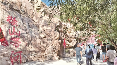 在铁门关景区的碑林前,游客们纷纷驻足拍照留念,静静感受历史底蕴。山体上“襟山带河”四个苍劲大字,更让人直观领略到这片土地依山傍水的磅礴气势。