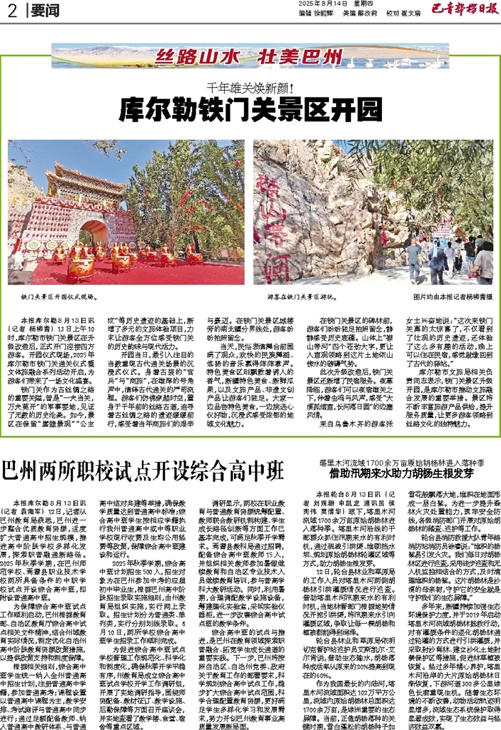 本报库尔勒8月13日讯 (记者 杨柳青) 13日上午10时,库尔勒市铁门关景区在升级改造后,正式开门迎接四方游客。开园仪式现场,2025年库尔勒市铁门关通关仪式暨文体旅融合系列活动开启,为游客们带来了一场文化盛宴。