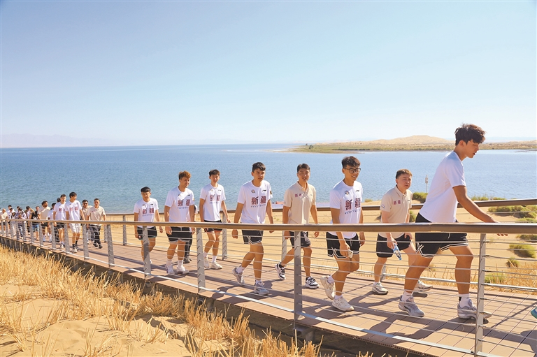新疆伊力特队队员则深度探访环博斯腾湖公路渔舟唱晚路段、明沙山路段及金沙滩旅游度假区。渔舟唱晚景区湖光与植被相映成趣,明沙山金黄沙丘与远处湖山构成绝美反差,而金沙滩的“迷塔城元宇宙”项目更让球员们体验了虚实交融的科技互动。
