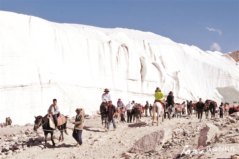 8月9日,游客在慕士塔格冰川公园骑马游览。初秋时节,慕士塔格冰川公园迎来了一年中最为迷人的季节,天高云淡,冰湖清澈柔美,洁白的冰川在阳光照耀下闪烁着银光,吸引了众多游客前来观光。石榴云/新疆日报记者 蔡增乐 摄