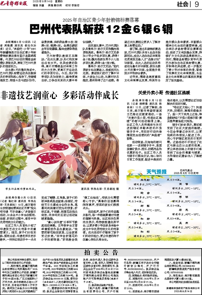 - 巴州代表队斩获12金6银6铜 本报博湖8月13日讯 (记者 周海霞 通讯员 都古尔加甫) 近日,“奔跑吧·少年”2025年新疆维吾尔自治区青少年射箭锦标赛在察布查尔县圆满落幕。代表巴州出征的博湖县射箭队表现优异,展现了巴州代表