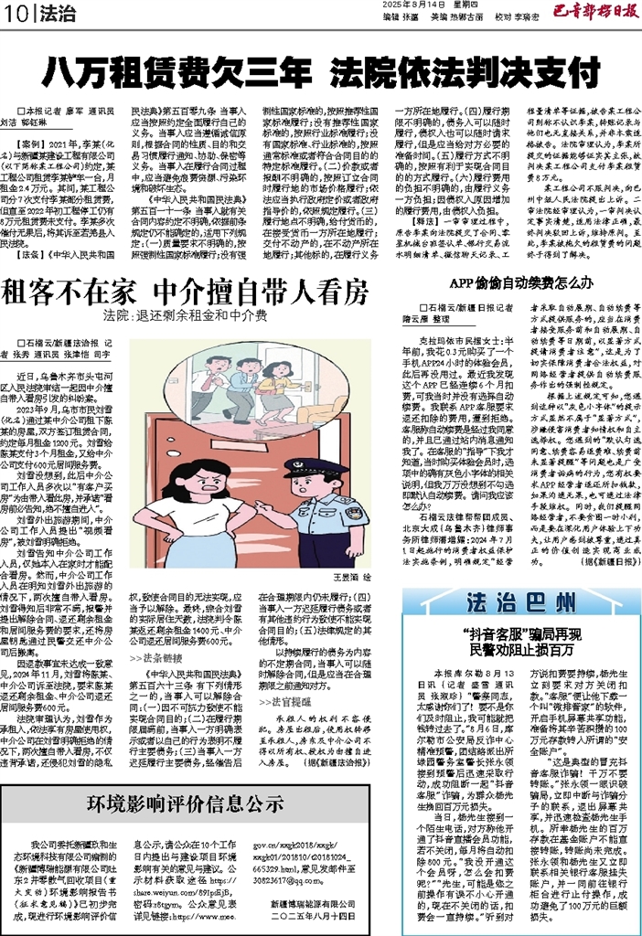 - 八万租赁费欠三年 法院依法判决支付 □本报记者 廖军 通讯员 刘洁 郭钰琳 【案例】 2021年,李某(化名)与新疆某建设工程有限公司(以下简称某工程公司)约定,某工程公司租赁李某铲车一台,月租金2.4万元。其间,某工程
