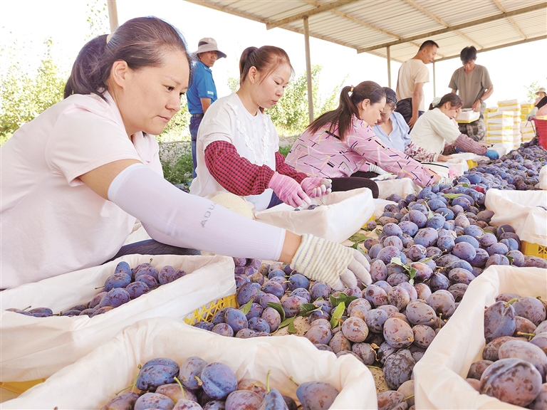 采摘季不仅充盈了果农的“钱袋子”,也为周边村民开辟了增收渠道。数十名村民在果园务工,从采摘到包装各司其职。“在家门口就能打工,一天能挣不少,还能兼顾家里,这个采摘季过得特别踏实!”正在分拣西梅的村民王大姐脸上洋溢着笑容。