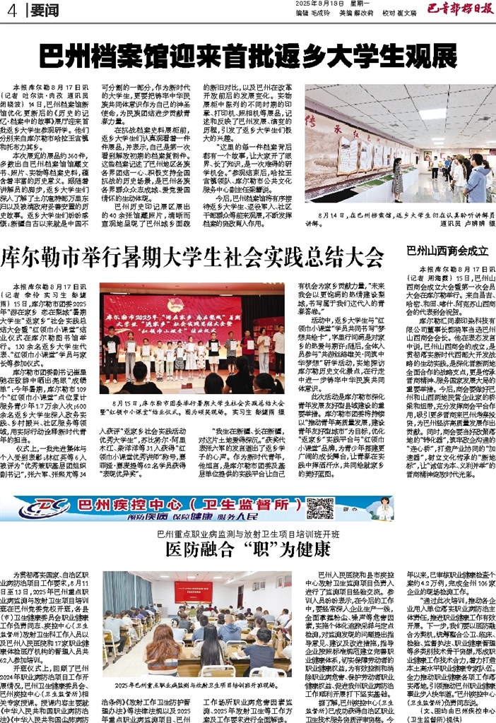 - 医防融合 “职”为健康 为贯彻落实国家、自治区职业病防治项目工作要求,8月11日至13日,2025年巴州重点职业病监测与放射卫生项目培训班在巴州党委党校开班,各县(市)卫生健康委员会职业健康工作负责同志、疾控中心(卫生监