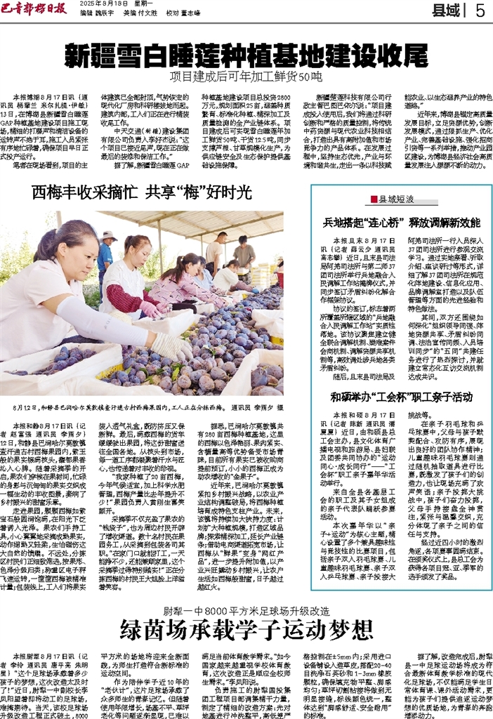 - 西梅丰收采摘忙 共享“梅”好时光 本报和静8月17日讯 (记者 赵富强 通讯员 李雨夕) 12日,和静县巴润哈尔莫敦镇查汗通古村西梅果园内,紫玉般的果实缀满枝头,馥郁果香沁人心脾。随着采摘季的开启,果农们穿梭在果树间,忙碌的身影与