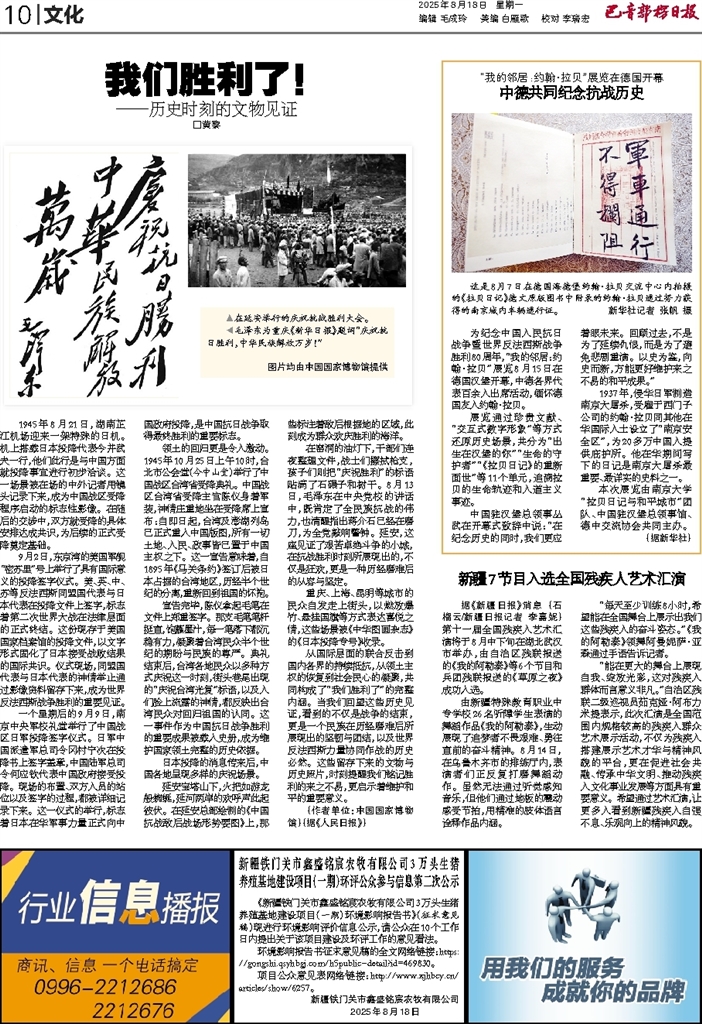 - 中德共同纪念抗战历史 为纪念中国人民抗日战争暨世界反法西斯战争胜利80周年,“我的邻居:约翰·拉贝”展览8月15日在德国汉堡开幕,中德各界代表百余人出席活动,缅怀德国友人约翰·拉贝。 展览通过珍贵文献、“交互式数字