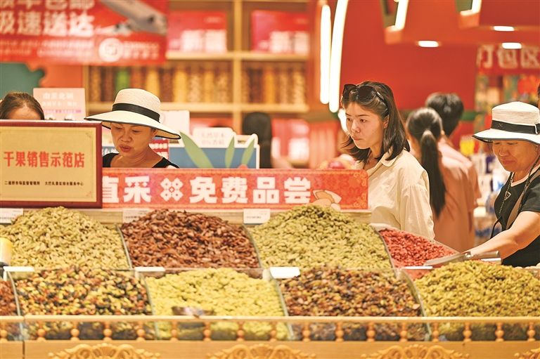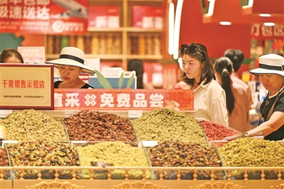 8月21日,游客在乌鲁木齐大巴扎步行街选购干果。