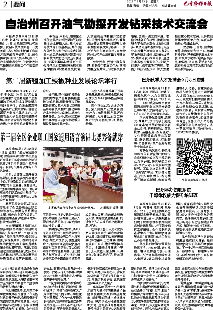 - 自治州召开油气勘探开发钻采技术交流会 本报库尔勒8月22日讯 (记者 赵富强 通讯员 潘学强) 21日,自治州召开油气勘探开发钻采技术交流会。州党委副书记、河北省援疆工作前方指挥部指挥长李广义,州党委常委、副州长鲁小辉,副州长岩小明出