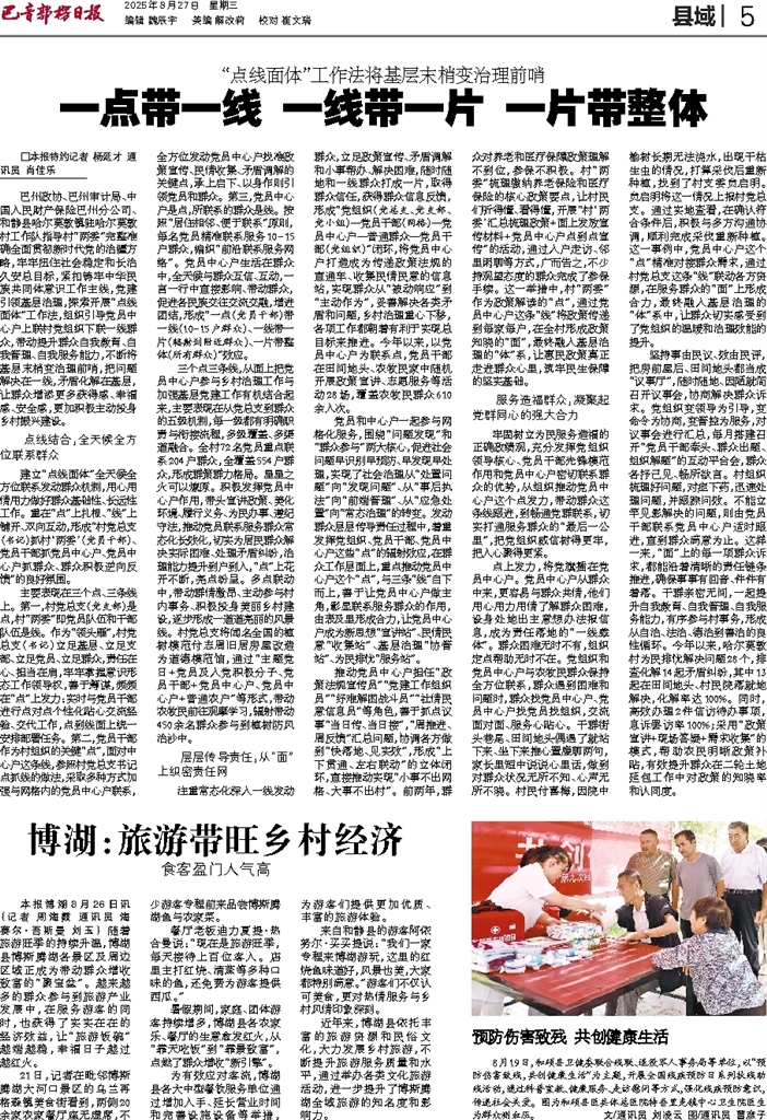 - 一点带一线 一线带一片 一片带整体 □本报特约记者 杨延才 通讯员 肖佳乐 巴州政协、巴州审计局、中国人民财产保险巴州分公司、和静县哈尔莫敦镇驻哈尔莫敦村工作队指导村“两委”完整准确全面贯彻新时代党的治疆方略,牢牢扭住社