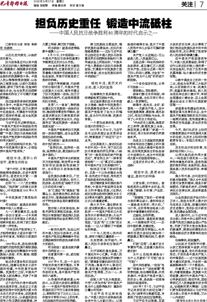 □新华社记者 胡浩 彭韵佳 徐鹏航 从沉沦走向荣光,从挫折走向复兴。 抗日战争是近代以来中国人民反抗外敌入侵持续时间最长、规模最大、牺牲最多的民族解放斗争,也是第一次取得完全胜利的