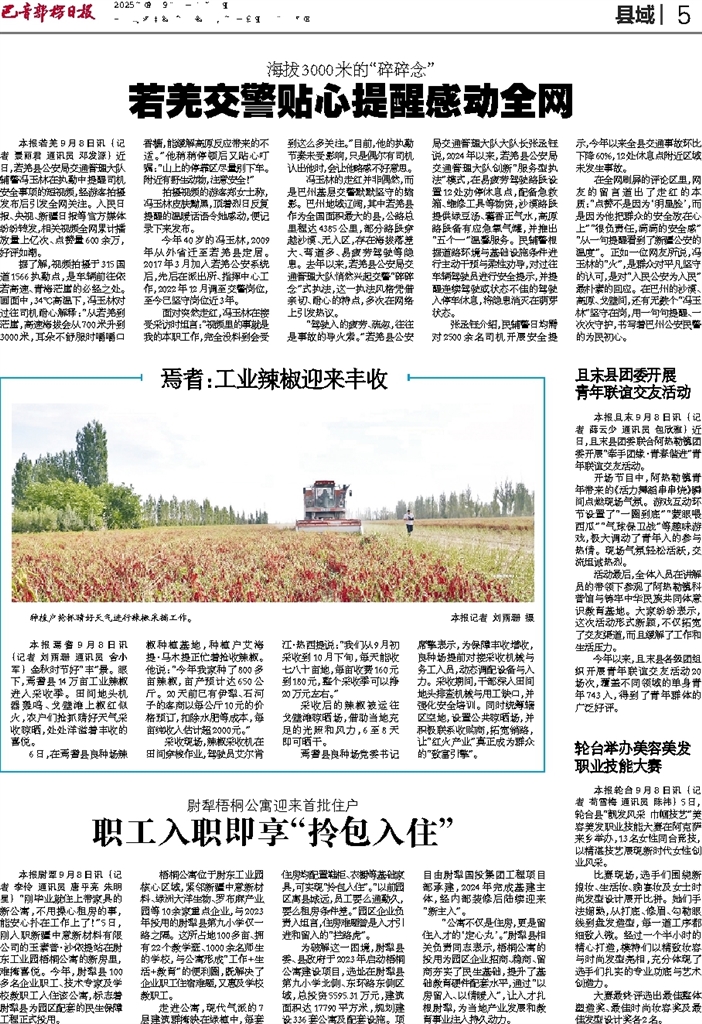 - 焉耆:工业辣椒迎来丰收 本报焉耆9月8日讯 (记者 刘雨珊 通讯员 舍小军) 金秋时节好“丰”景。眼下,焉耆县14万亩工业辣椒进入采收季。田间地头机器轰鸣、戈壁滩上椒红似火,农户们抢抓晴好天气采收晾晒,处处洋溢着丰收的喜