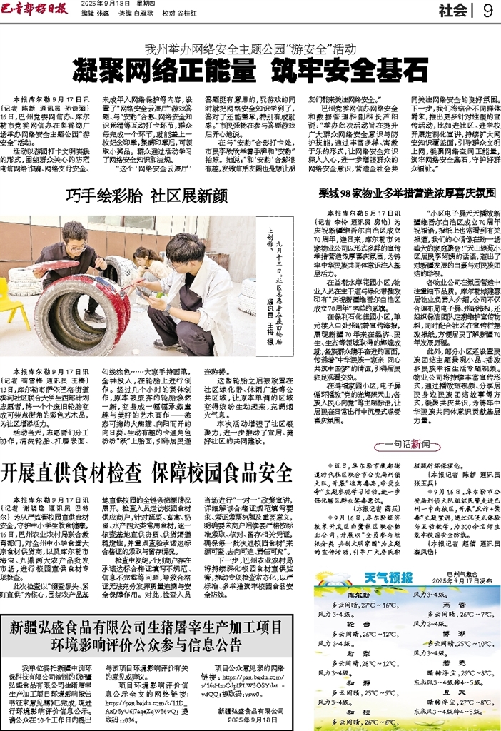 - 凝聚网络正能量 筑牢安全基石 本报库尔勒9月17日讯 (记者 陈新 通讯员 孙诗涵) 16日,巴州党委网信办、库尔勒市党委网信办在梨香湖广场举办网络安全主题公园“游安全”活动。 活动以游园打卡文明实践的形式,围绕群众关心的