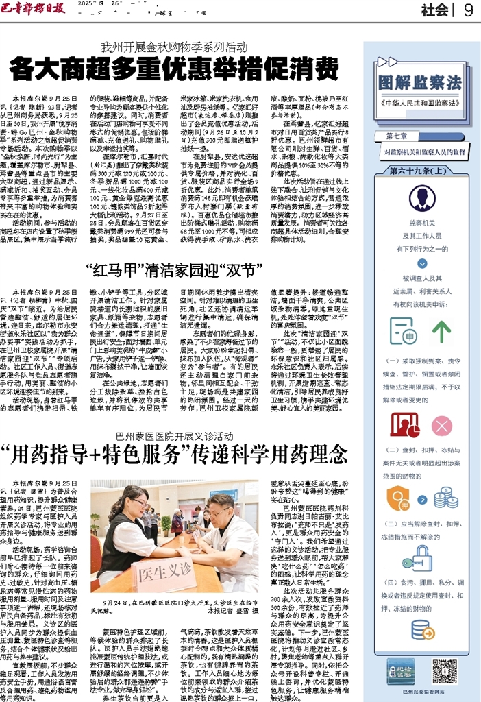 在库尔勒市,汇嘉时代(新汇嘉)推出了穿戴类秋装满300元减120元或100元、冬季新品满1000元减100元、一线化妆品满600元减100元、黄金每克最高优惠100元、镶嵌类饰品5折起等大幅让利活动。9月27日至28日,会员顾客在百货区穿戴类消费满999元还可参与抽奖,奖品涵盖10克黄金、米家冰箱、米家洗衣机、食用油及厨房抽纸等。亿家汇好超市(凌达店、银泰店)则推出了会员充值优惠活动,活动期间(9月26日至10月2日)充值300元即赠送植护抽纸一提。