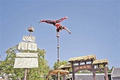 9月25日,杂技艺人在吴桥杂技大世界江湖文化城内表演。