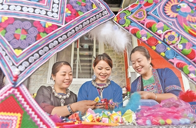 侗族吉祥花是广西三江侗族自治县的传统手工艺品,由心灵手巧的侗族女性一丝一线编织而成,融侗族印染、刺绣、织锦等技艺于一体,最早用来悬挂在风雨桥、鼓楼等公共建筑中,是祈求风调雨顺的吉祥饰品,其制作技艺列入柳州市非物质文化遗产代表性项目名录。近年来,广西三江积极研发文旅产品,侗族吉祥花从传统的公共建筑挂饰变成人们身上的寻常饰品,日益热销文旅市场。新华社记者 陆波岸 摄
