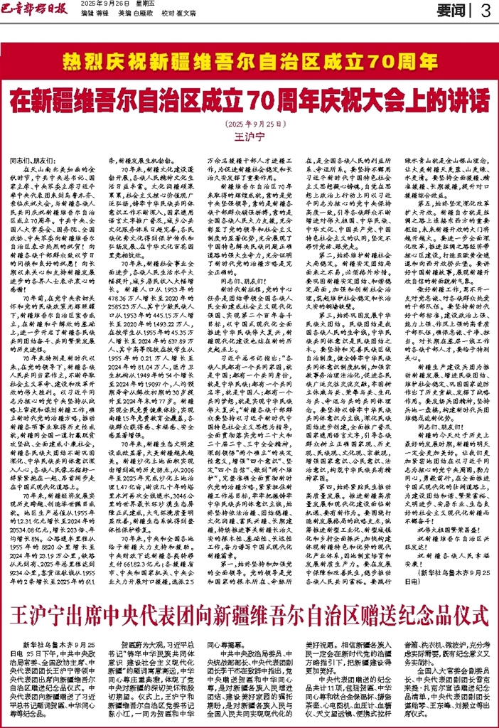 - 王沪宁出席中央代表团向新疆维吾尔自治区赠送纪念品仪式 新华社乌鲁木齐9月25日电 25日下午,中共中央政治局常委、全国政协主席、中央代表团团长王沪宁带领中央代表团出席向新疆维吾尔自治区赠送纪念品仪式。中央代表团向新疆赠送了习近平总书记题词贺匾、中华同