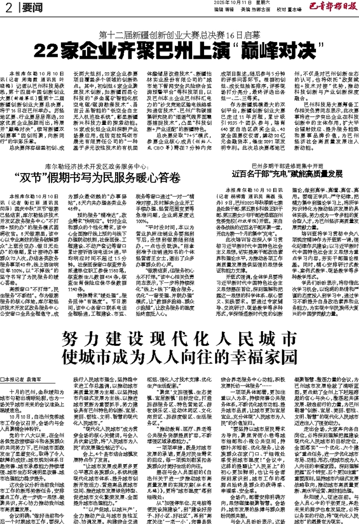 - 努力建设现代化人民城市 使城市成为人人向往的幸福家园 □本报记者 袁海军 十月的巴州,金秋暖阳为城市勾勒出清晰轮廓,也为一场关乎城市未来的会议渲染上温暖底色。 10月10日,自治州党委城市工作会议召开,会场内与会人员聚精会神聆听。