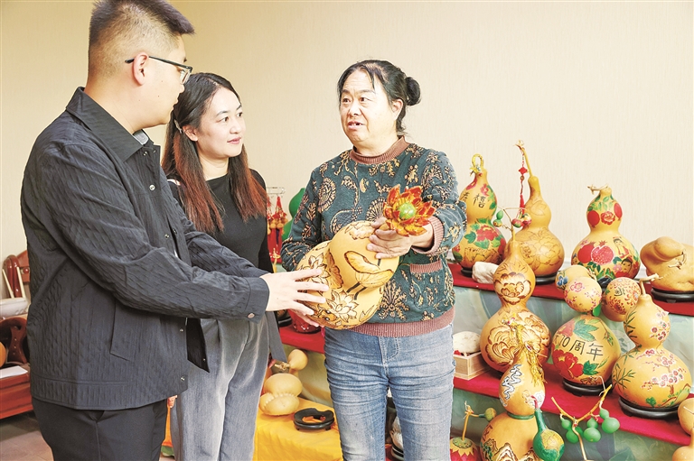 近日,焉耆县永宁镇下岔河村乡土人才为游客介绍通过烫画技术制作的葫芦手工艺品。