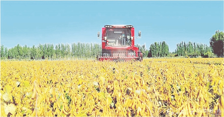 大型机械在新疆大豆育种家泽普基地收获大豆(10月10日摄)。这两日,自治区农业科学院作物研究所国家大豆产业技术体系南疆综合试验站组织专家在该基地对中黄30与专门为南疆培育的合农138大豆品种进行了测产,两个品种亩产均突破300公斤。