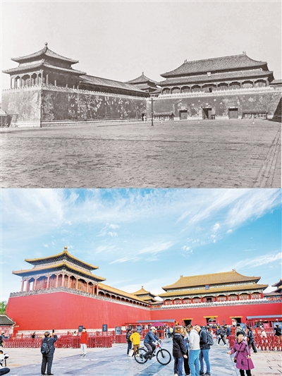 拼版照片:上图为20世纪初拍摄的午门及西雁翅楼(故宫博物院供图);下图为2025年10月10日拍摄的午门及西雁翅楼(新华社记者金良快摄)。