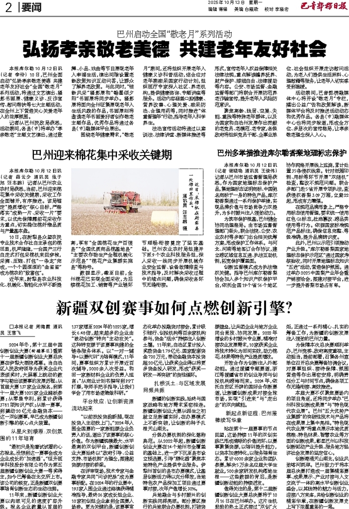 - 巴州迎来棉花集中采收关键期 本报库尔勒10月12日讯(记者 薛云少 通讯员 张子旭 汪志鹏) 记者从巴州农业农村局获悉,当前,巴州迎来棉花集中采收关键期,采收工作全面铺开,有序推进。该局锚定“提质增收”核心目标,严格落实“成