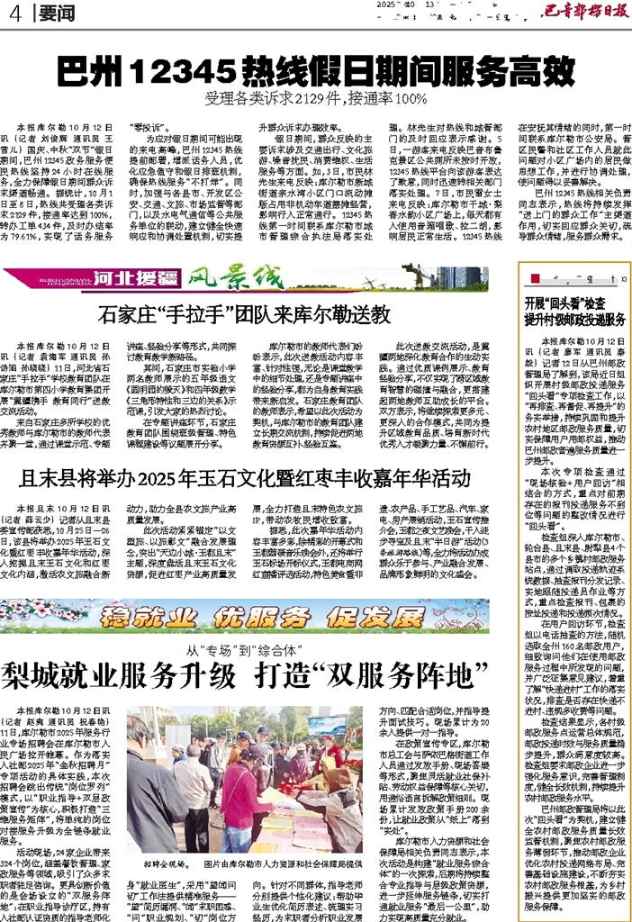 - 巴州12345热线假日期间服务高效 本报库尔勒10月12日讯 (记者 刘俊辉 通讯员 王雪儿) 国庆、中秋“双节”假日期间,巴州12345政务服务便民热线坚持24小时在线服务,全力保障假日期间群众诉求渠道畅通。据统计,10月1日至8