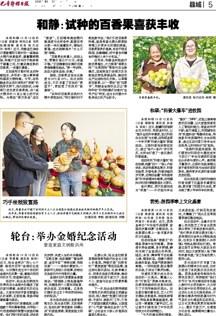 - 若羌:游园季奉上文化盛宴 本报若羌10月12日讯 (记者 陈彦强 通讯员 吐逊阿依·吐尔迪 王中信 张达 阿迪力·米吉提) 近日,若羌县举办“中华佳节游园季 家国同庆喜相聚”主题活动,为各族群众奉上一场丰富多彩的文化盛宴。