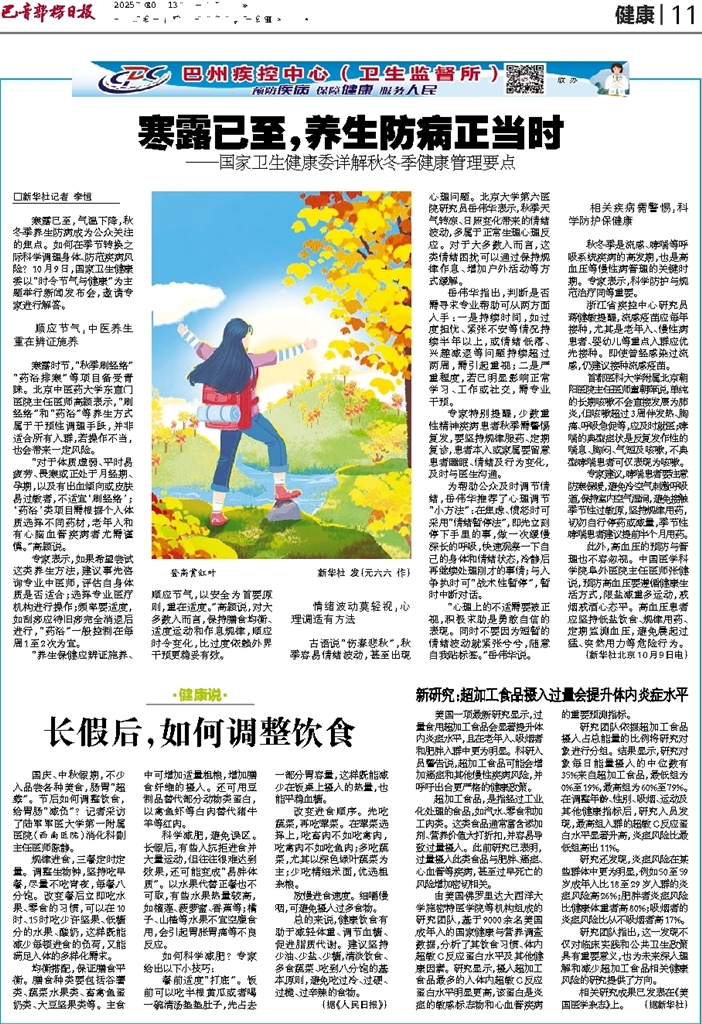 - 寒露已至,养生防病正当时 □新华社记者 李恒 寒露已至,气温下降,秋冬季养生防病成为公众关注的焦点。如何在季节转换之际科学调理身体、防范疾病风险?10月9日,国家卫生健康委以“时令节气与健康”为主题举行新闻发布