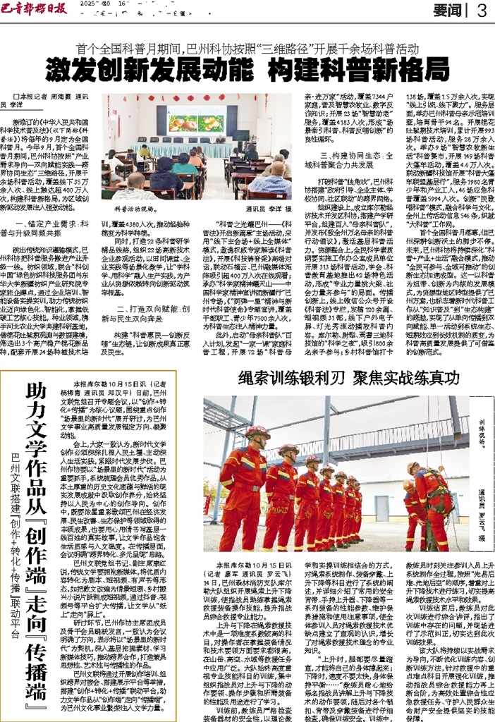 - 助力文学作品从“创作端”走向“传播端” 本报库尔勒10月15日讯 (记者 杨柳青 通讯员 邓汉平) 日前,巴州文联党组召开专题会议,以“创作+转化+传播”为核心议题,围绕重点创作“场景里的新时代”展开研讨,为巴州文学事业高质量发展锚定方
