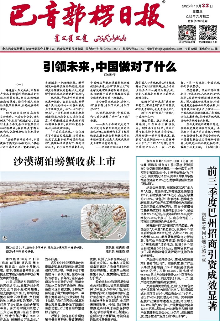 - 沙漠湖泊螃蟹收获上市 本报轮台10月21日讯 (记者 刘雨珊 通讯员 侯宪伟 杨惠杰) 金秋十月蟹儿肥。眼下,在轮台县草湖乡,渔民正忙着在沙漠湖泊中收获膏肥体黄的螃蟹。 21日,在草湖乡四面环沙的天然湖泊上,养殖户