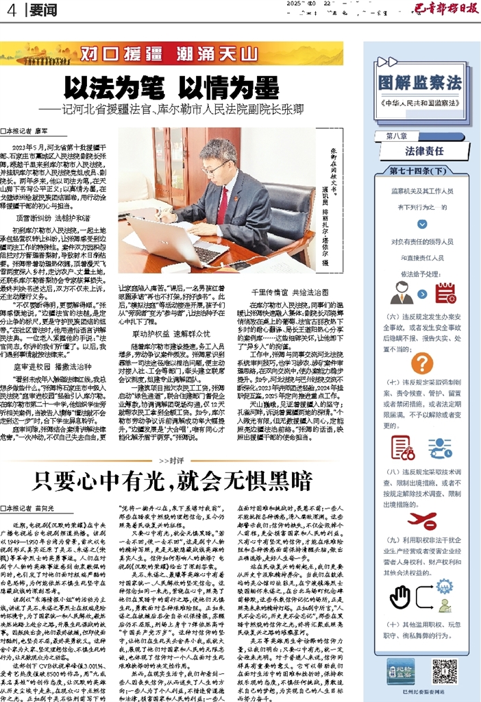 □本报记者 廖军 2023年5月,河北省第十批援疆干部、石家庄市藁城区人民法院副院长张卿,跨越千里来到库尔勒市人民法院,并挂职库尔勒市人民法院党组成员、副院长。两年多来,他以司法为笔,