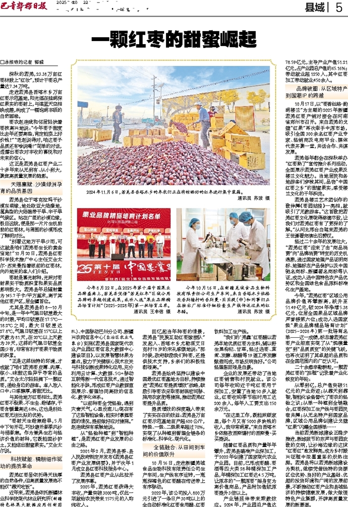 □本报特约记者 郭城 深秋的若羌,23.38万亩红枣林披上“红妆”,预计干枣总产量达7.34万吨。 走进若羌县吾塔木乡万亩红枣示范基地,阳光洒在挂满深红果实的枣树上,与湛蓝天空相映