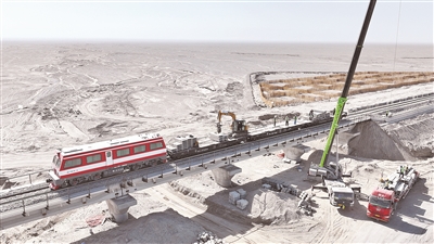 10月13日,在罗若铁路施工现场,轨道车、东风4内燃机车、机养车与焊轨机轰鸣声不断,工程指挥车往来穿梭。近百名铺架作业人员奋战在施工一线,争分夺秒推进罗若铁路米兰至罗布泊段的建设。