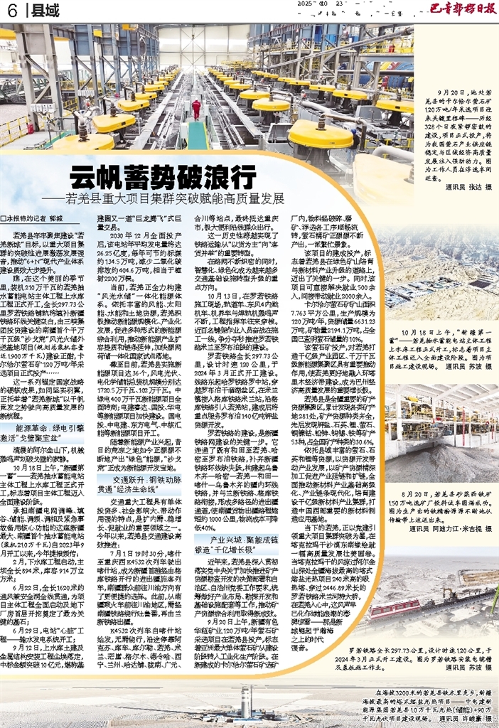 瞧,在这个美丽的季节里,装机210万千瓦的若羌抽水蓄能电站主体工程上水库工程正式开工,全长297.73公里罗若铁路铺轨将填补新疆铁路环线关键空白,由三峡集团投资建设的南疆首个千万千瓦级“沙戈荒”风光火储外送基地项目(规划总装机容量近1900万千瓦)建设正酣,卡尔恰尔萤石矿120万吨/年采选项目正式投产……