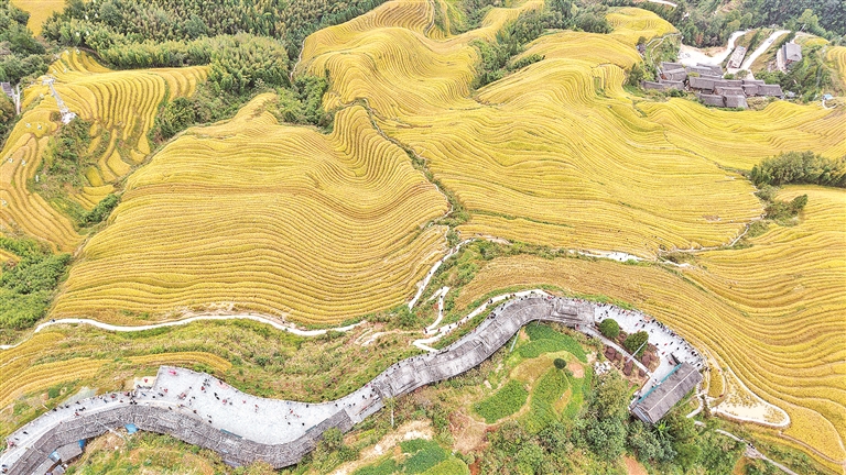 眼下,广西龙胜各族自治县龙脊梯田一片金黄,成为众多游客观光“打卡”的热门景点。龙脊梯田已有2300多年历史,是联合国粮农组织认证的全球重要农业文化遗产。