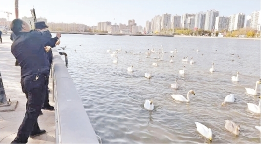 这支由库尔勒市住建局牵头组建的守护队伍,由8名专业监察员组成,每年9月至次年3月实行24小时轮班制,通过科学投喂、全程守护与应急救助三大举措,为越冬天鹅构筑起一道坚实的保护屏障。