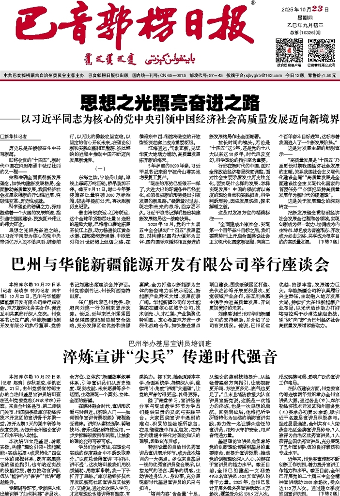 - 巴州与华能新疆能源开发有限公司举行座谈会 本报库尔勒10月22日讯(记者 杨晓东 特约记者 刘宇博) 10月22日,巴州与华能新疆能源开发有限公司举行座谈会,双方就深化务实合作、促进互利共赢进行深入交流。州党委书记任广鹏,华能新疆能源开发