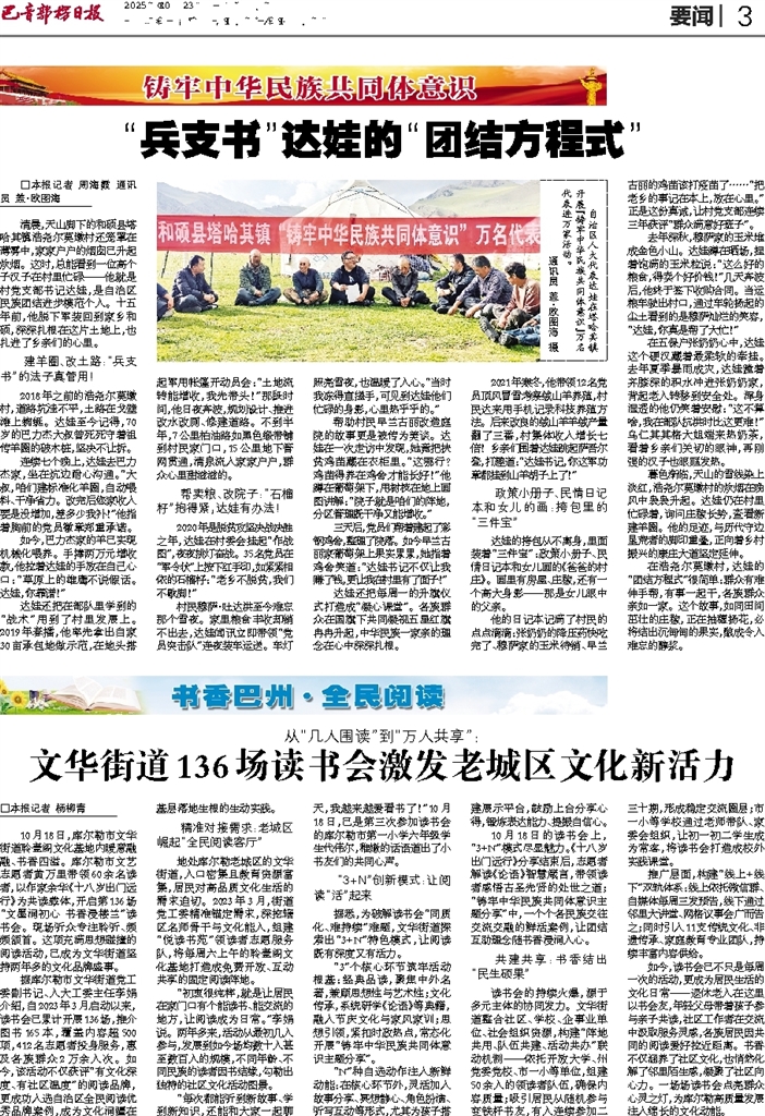 □本报记者 杨柳青 10月18日,库尔勒市文华街道聆壹阁文化基地内暖意融融、书香四溢。库尔勒市文艺志愿者黄万里带领60余名读者,以作家余华《十八岁出门远行》为共读载体,开启第136场“