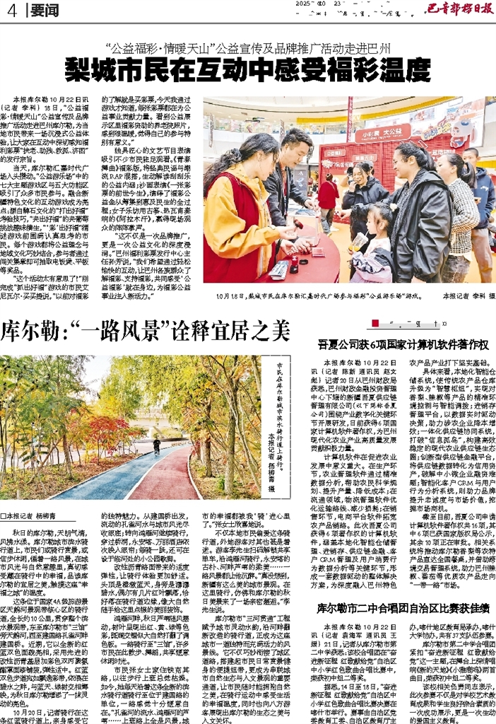 - 梨城市民在互动中感受福彩温度 本报库尔勒10月22日讯 (记者 李科) 18日,“公益福彩·情暖天山”公益宣传及品牌推广活动走进巴州库尔勒,为当地市民带来一场沉浸式公益体验,让大家在互动中深切感知福利彩票“扶老、助残、救孤、济