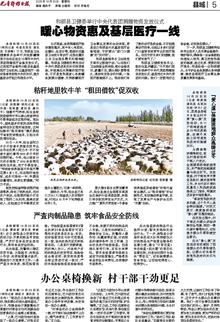 - 办公桌椅换新 村干部干劲更足 本报和静10月22日讯 (特约记者 杨延才 通讯员 王志伟) “现在办公条件越来越好,服务群众的劲头越来越足。”20日,和静县哈尔莫敦镇哈尔莫敦村村委会主任何其鹏坐在刚更换的办公座椅上感慨道。