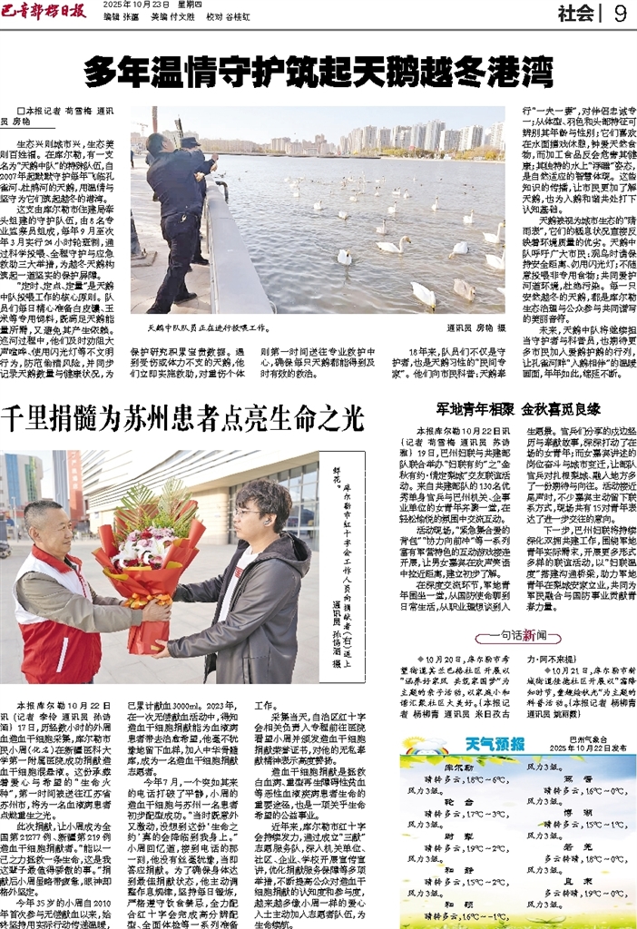 - 多年温情守护筑起天鹅越冬港湾 □本报记者 苟雪梅 通讯员 房艳 生态兴则城市兴,生态美则百姓福。在库尔勒,有一支名为“天鹅中队”的特殊队伍,自2007年起默默守护每年飞临孔雀河、杜鹃河的天鹅,用温情与坚守为它们筑起