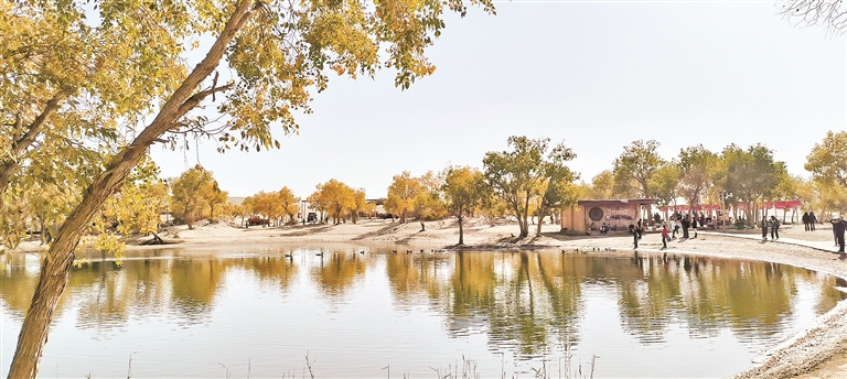 19日,记者走进这片秘境探访。这里的胡杨独具特色,不仅扎根广袤沙漠展现“坚韧风骨”,更依傍沙漠中的湖泊尽显“灵动之美”。金黄的胡杨倒映在清澈的湖面,蓝天、黄沙、碧水与金色胡杨相映成趣,“水绕胡杨”的独特景观,彻底打破了人们对沙漠胡杨“干旱孤寂”的固有印象。