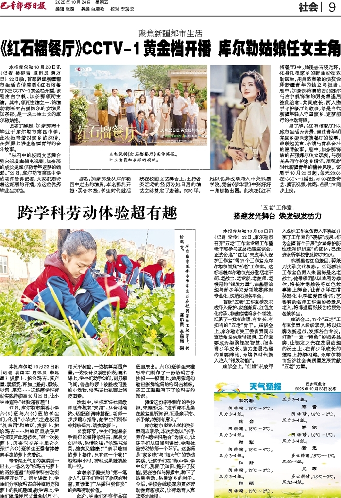 本报库尔勒10月23日讯(记者 杨柳青 通讯员 黄万里) 22日晚,首部聚焦新疆都市生活的情感剧《红石榴餐厅》在CCTV-1黄金档开播,该剧由白宇帆、加奈那领衔主演。其中,领衔主演之一、饰演动物医生古丽娜尔的女演员加奈那,是一名土生土长的库尔勒姑娘。